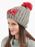 Стильная шапка выполнена из вязаного фактурного материала. Декорирована большим помпоном. Спереди украшена аппликацией в виде банта со стразами. Яркий вариант на каждый день!