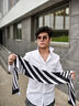 Красивый шарф, выполнен из натуральной шелковой ткани, классическая черно-белая раскраска поможет комбинировать аксессуар с разной одеждой, а продольная полоска сделает Ваш образ стильным и модным. Размер: 16х155 см.