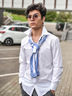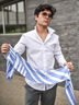 Полосатый шелковый шарф, выполнен в голубых и белых тонах, отлично подойдет для повседневной носки. Размер: 16х155 см.