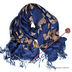 Порадуйте себя этим великолепным шарфом с актуальным принтом «бабочка» и благородным сочетанием синего и коричневого цветов. Особенностью и одновременно преимуществом данной модели является его двойная основа. С одной стороны – это хлопковая поверхность, с другой – тончайший шелк. Данная модель прекрасно сохраняет тепло. Украшением служит короткая бахрома.