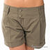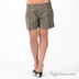 Легкие летние шорты коричневого цвета. Расклешенный крой брючин. Широкий пояс-кокетка с застежкой на пуговицы и молнию. На поясе шлевки для ремня. Низ шорт декорирован широкими манжетами-отгибами. Боковые врезные карманы.