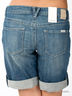 Джинсовые шорты с отворотами. Отрезной пояс со шлевками. Застегиваются спереди на молнию и пуговицу. Пять карманов.