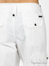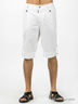 Шорты мужские белого цвета. Классический крой. Отрезной пояс, есть шлевки для ремня. Застежка на молнии и пиговице. Шесть карманов - два спереди, два прорезных с клапанами сзади и два накладных кармана на брючинах. По нижнему краю брючин отвороты, декорированы хлястиками.