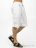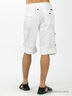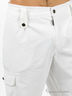 Шорты мужские белого цвета. Классический крой. Отрезной пояс, есть шлевки для ремня. Застежка на молнии и пиговице. Шесть карманов - два спереди, два прорезных с клапанами сзади и два накладных кармана на брючинах. По нижнему краю брючин отвороты, декорированы хлястиками.