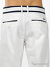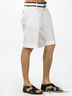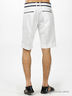 Элегантные мужские шорты белого цвета в "морском" стиле. Отрезной пояс со вставками темно-синего цвета. Есть шлевки для ремня. Застегиваются на молнию и кнопку. Два глубоких кармана спереди. Два прорезных кармана с клапанами оригинальной формы сзади. Задние карманы застегиваются на пуговицы. По нижнему краю брючин идут отвороты.
