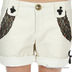 Непринужденность и комфорт, что еще нужно в жаркую погоду! Слегка заниженная линия талии. Застежка на молнию. Два прорезных кармана спереди и два накладных кармана сзади декорированы контрастным кружевом. Шлевки разной длины и формы, красивые пуговицы, отделочные строчки по всем швам украшают изделие. Необычные застежки по бокам позволяют регулировать длину шорт и менять образ по Вашему усмотрению