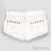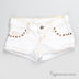 Короткая модель застегивается на пуговицу и молнию. К поясу пришиты шлевки. Два передних кармана, два задних кармана. Края карманов декорированы заклепками.