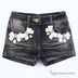 Стильные джинсовые шорты для девочки с отрезной поясом. Застегиваются на молнию и пуговицу. Дополнены оригинальными декоративными элементами.