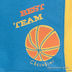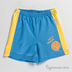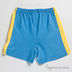 Модель прямого кроя. В пояс вшита резинка. По бокам желтые вставки. На левой брючине декоративная аппликация.