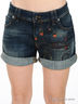 Детали: втачной пояс и шлевки под ремень, пять карманов, застежка на молнии и на пуговице, шорты украшены ярким принтом, снизу завернуты, вытерты.