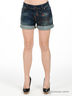 Детали: втачной пояс и шлевки под ремень, пять карманов, застежка на молнии и на пуговице, шорты украшены ярким принтом, снизу завернуты, вытерты.
