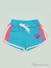 Симпатичные короткие шортики с контрастными вставками, пояс регулируется шнурком. Модель декорирована принтом цветочком и стразами.