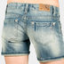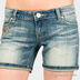 Стильные синие джинсовые женские шорты. Плотная ткань, пять карманов. Искусственные потертости, замятости, застежка на молнию и пуговицу. Эти шорты выглядят очень стильно!