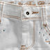 Короткая модель прямого кроя застегивается на молнию и пуговицу. К поясу пришиты шлевки. Четыре передних кармана, два задних кармана. Передние карманы украшены стразами, задние металлической цепочкой, изображающей шнуровку, цепочку можно снять. Декоративные отвороты.
