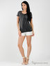 Детали: отрезной широкий пояс со шлевками для ремня, застежка на пуговицы и молнию, два прорезных кармана спереди, два накладных сзади.