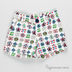 Короткая модель прямого кроя застегивается на пуговицу и молнию. В пояс вставлена резинка, пришиты шлевки. Два передних кармана, один задний карман. Декоративные отвороты. Множественные принты.