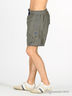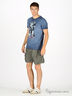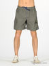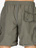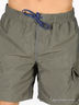 Мужские шорты для плаванья из плащевки. На поясе посажены на широкую резинку. Застегиваются на липучку и завязку. Два прорезных кармана спереди, два накладных с клапанами на липучке по бокам и один накладной сзади. Украшены контрастной прострочкой. Сетчатая подкладка.