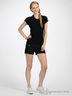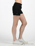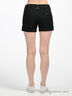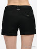 Женские шорты из лоснящегося шелковистого материала. Отрезной пояс, широкие шлевки для ремня. Два втачных кармана. Брючины с отворотами. Шорты застегиваются на молнию, вшитую в боковой шов. Украшены кнопками и клепками.