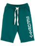 Шорты удлиненные, спереди карманы с отрезным бочком. По боковому печать. Сзади один накладной карман. Низ шорт подвернут. В поясе продернут шнур. Изготовлены из петельчатого футера с эластаном.