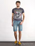 Детали: отрезной пояс со шлевками для ремня, застежка на пуговицу и молнию, два накладных кармана сзади.
