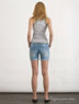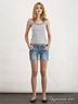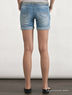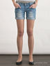 Элегантные шорты из хлопкового денима. Отрезной пояс со шлевками для ремня. Застежка на пуговицу и молнию. Спереди прорезные карманы, сзади два накладных. Короткие слегка зауженные брючины с декоративными подворотами. Декоративные потертости на брючинах.