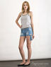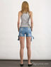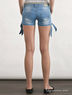 Стильные шорты из хлопкового денима. Отрезной пояс со шлевками для ремня. Застежка на пуговицу и молнию. Спереди два прорезных кармана, сзади два накладных. Спереди шорты декорированы вертикальными защипами. Короткие брючины с манжетами, дополненными завязками.