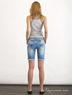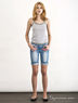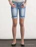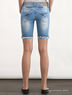 Модные женские шорты из хлопкового денима. Отрезной пояс со шлевками для ремня. Сзади два накладных кармана. Укороченные зауженные брючины с отворотами. Шорты декорированы потертостями.