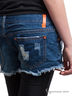 Короткие шорты с застежкой на молнию и яркую пуговицу. Потертые детали и обтрепанные края. Пояс со шлевками (2 шлевки яркого неонового цвета). Контрастная отстрочка и заклепки на карманах спереди и сзади. Видимые мешковины карманов яркого цвета. Размер по росту в см.