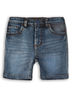 Джинсовые шорты с застежкой на молнию и пуговицу. Карманы по бокам, на талии шлевки для ремня.