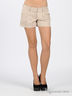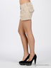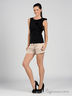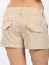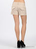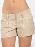 Короткие шорты из плотного шелковистого материала. Широкий отрезной пояс. Есть шлевки для ремня. Застегиваются на молнию и крючок. Два втачных кармана спереди, сзади имитация карманов с клапанами. Прямоугольная кокетка сзади. Спереди декоративные складки.