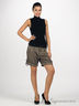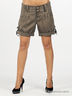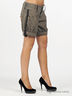 Стильные шорты прямого кроя из плотной, неэластичной ткани с эффектом лоска. Застегиваются на молнию с двумя большими декоративными пуговицами. Фигурный широкий пояс со шлевками для ремня. Четыре кармана. Низ изделия дополнен прошитым подворотом. По боками шорты декорированы хлястиками с металлическими пряжками. Задние карманы декорированы стразами.