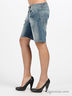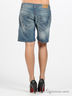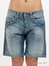 Джинсовые шорты свободного покроя с эффектом потертости. Отрезной пояс. Есть шлевки для ремня. Застегивается на болты. Сзади треугольная кокетка. Пять карманов.