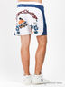 Детали: отрезной пояс на кулиске со шнурком, два прорезных кармана на молнии спереди, сетчатые трусы внутри, боковые разрезики, стильный цветной печатный принт сзади.