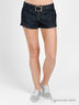 Джинсовые шорты прямого кроя. Отрезной пояс со шлевками для ремня и регулируемый ремешок. Застежка на молнию. Треугольная кокетка. 4 кармана.