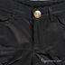 Короткая модель прямого кроя застегивается на пуговицу и молнию. К поясу пришиты шлевки. Брючины посажены на манжеты. Два передних кармана, два задних кармана. Декоративная нашивка на заднем кармане.