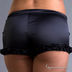 Шорты из черного атласа придутся по душе многим девушкам. Удобная и в то же время очень стильная вещь для домашней одежды и отдыха на море. Отделка - атласные рюши и металлическая пряжка.
