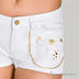 Стильные ультракороткие шорты из светлого денима на лето. Спереди и сзади декорированы накладными карманами, с элементами застежки молнии, а также меньшими накладными кармашками с клапанами, на пуговице и клепками. Все швы отстрочены плотной нитью. Изделие дополнено яркой фурнитурой золотого цвета. Шорты прекрасно подойдут смелым особам, которые даже в жаркие дни не могут отказаться от любимых джинсов.