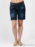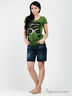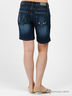Детали: отрезной пояс со шлевками для ремня, два прорезных кармана и один кармашек на молнии спереди, два накладных сзади. Модель декорирована контрастными швами.