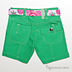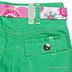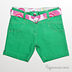 Зеленые джинсовые шорты с ярким поясом. Спереди два кармана. Сзади два накладных кармана. Один из них с ремешком на кнопке со стразой.