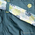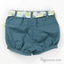 Короткие шорты свободного кроя застегиваются на молнию и пуговицу. В пояс вшита резинка. К поясу пришиты петли для ремня, в которые вставлен декоративный тканевый пояс. Два передних кармана. Брючины посажены на манжеты, за счет чего смотрятся "фонариками". Декоративные элементы: принт на левой брючине, пуговицы на манжетах.