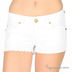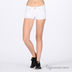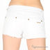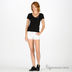 Короткая модель прямого кроя застегивается на пуговицу и молнию. К поясу пришиты петли для ремня. Три передних кармана, два задних карман. Декоративная бахрома по низу брючин, металлические элементы на заднем кармане.