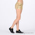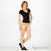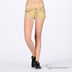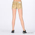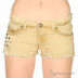 Короткие джинсовые шорты. Отрезной пояс, есть шлевки для ремня. Пять карманов. Застегиваются на молнию и пуговицу. Края брючин не обработаны. Шорты украшены клепками.