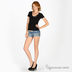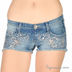 Женские джинсовые шорты. Отрезной пояс, есть шлевки для ремня. Пять карманов. Застегиваются на молнию и пуговицу. Края брючин не обработаны. Украшены декоративноц перфорацией с цветочной вышивкой и стразами.