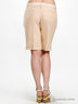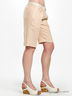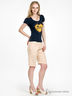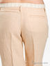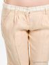 Модель прямого кроя застегивается на крючок и молнию. К поясу пришиты петли для ремня. Два передних кармана, один задний карман. Декоративные отвороты на брючинах, складки.