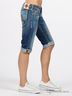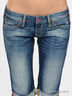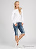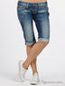 Джинсовые шорты прямого покроя с отворотами. Отрезной пояс, есть шлевки для ремня. пять карманов. Застегивается на молнию и пуговицу. Декорированы контрастной прострочкой, красными клепками и легким эффектом потертости.