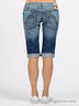 Джинсовые шорты прямого покроя с отворотами. Отрезной пояс, есть шлевки для ремня. пять карманов. Застегивается на молнию и пуговицу. Декорированы контрастной прострочкой, красными клепками и легким эффектом потертости.