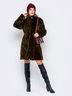Удлиненная шуба из искусственного полированного меха, выполненная методом поперечного кроя. Изделие с высоким воротником-стойкой на пуговице. Полочка дополнена прорезными карманами для удобства в носке. Застегивается петельками-застежками по всей длине. Дополнена поясом из основного материала. Изделие рассчитано на температурный режим от +5°С.