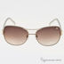 Стильные солнцезащитные очки от Lacoste. Тонкая металлическая оправа золотистого цвета. Оригинальный дизайн мостика. Металлические вставки по бокам оправы соединяют рамку и пластиковые заушники молочного оттенка. Левый заушник украшен надписью Lacoste, а уголок левой линзы – маленьким металлическим крокодилом. Линзы с градиентом.