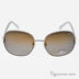 Солнцезащитные очки в тонкой и легкой оправе из глянцевого металла белого цвета. Левая линза украшена металлическим крокодилом – логотипом Lacoste. Тонкие пластиковые заушники. У основания левого заушника надпись Lacoste металлическими буквами. Зеркальные линзы.