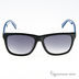 Простые, но модные женские очки в оправе из глянцевого пластика. Заушники синего цвета, основание заушников декорировано надписью в виде логотипа марки. Линзы пластиковые темного цвета с легким градиентом.